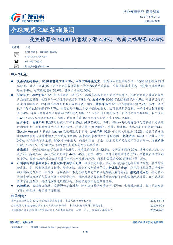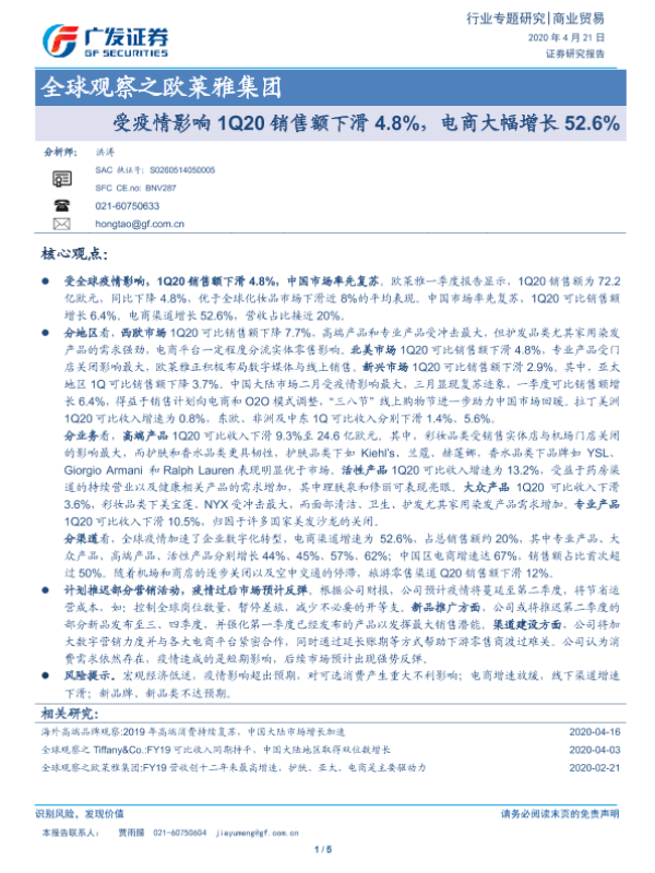 【广发证券】【20200421】全球观察之欧莱雅集团-受疫情影响1Q20销售额下滑4.8%,电商大幅增长52.6%-5页