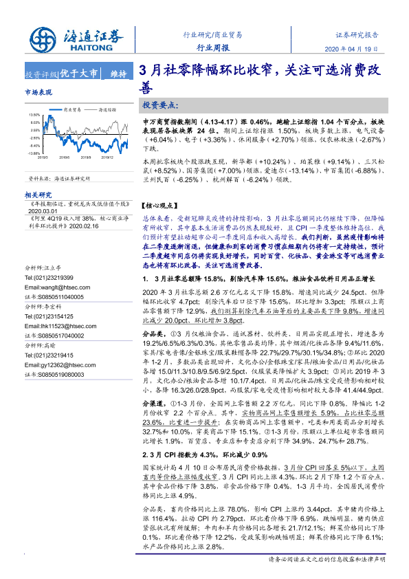 【海通证券】【20200419】商业贸易行业周报:3月社零降幅环比收窄,关注可选消费改善-6页
