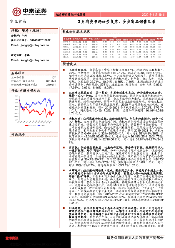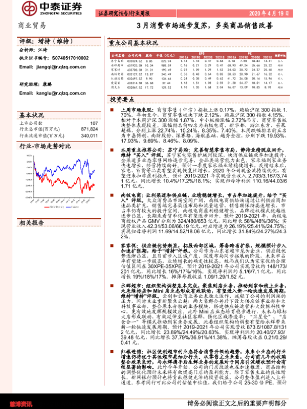 【中泰证券】【20200419】3月消费市场逐步复苏,多类商品销售改善-13页
