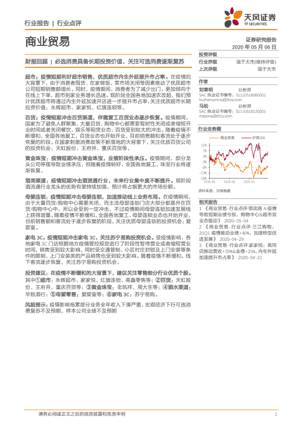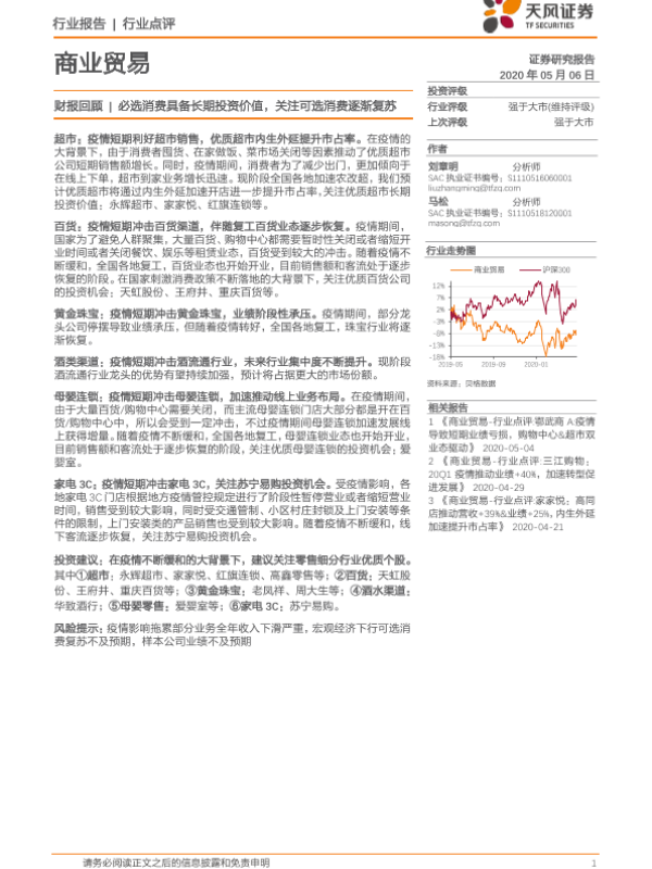 【天风证券】【20200506】商业贸易财报回顾:必选消费具备长期投资价值,关注可选消费逐渐复苏-10页