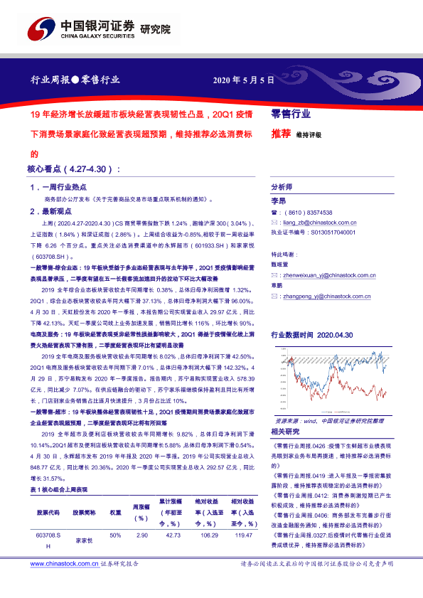 【银河证券】【20200505】零售行业周报:19年经济增长放缓超市板块经营表现韧性凸显,20Q1疫情下消费场景家庭化致经营表现超预期-43页