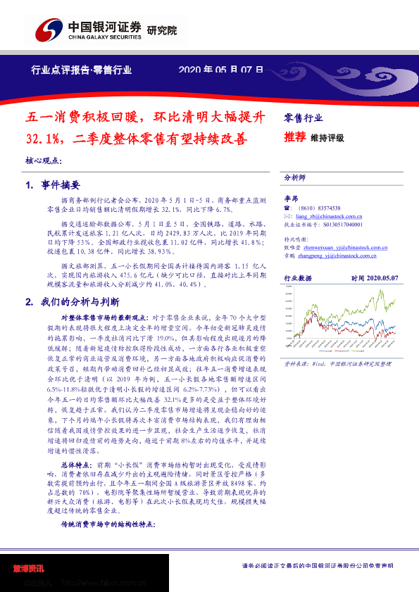 【银河证券】【20200507】五一消费积极回暖,环比清明大幅提升32.1%,二季度整体零售有望持续改善-6页