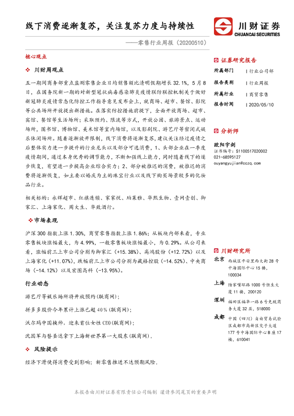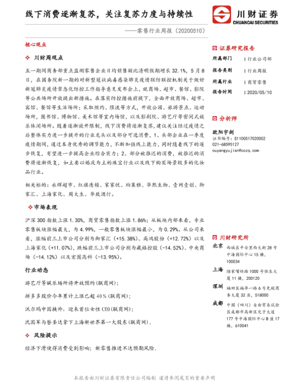 【川财证券】【20200510】零售行业周报:线下消费逐渐复苏,关注复苏力度与持续性-13页