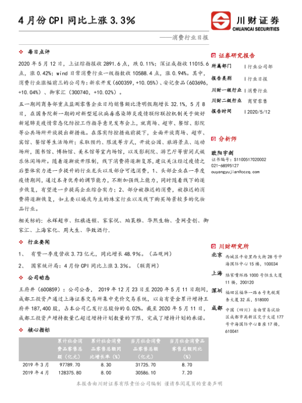 【川财证券】【20200512】4月份CPI同比上涨3.3%-4页