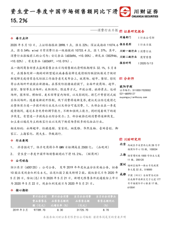 【川财证券】【20200513】消费行业日报:资生堂一季度中国市场销售额同比下滑15.2%-3页