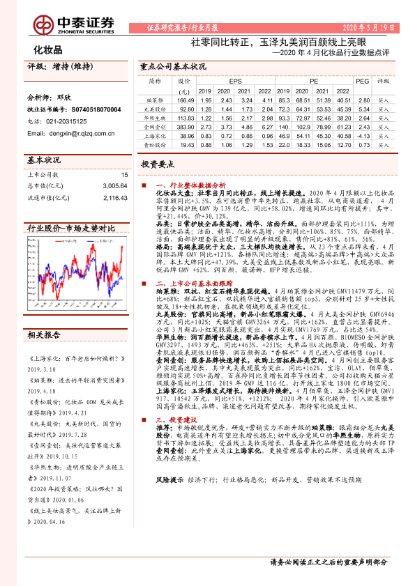 【中泰证券】【20200519】2020年4月化妆品行业数据点评:社零同比转正,玉泽丸美润百颜线上亮眼-15页