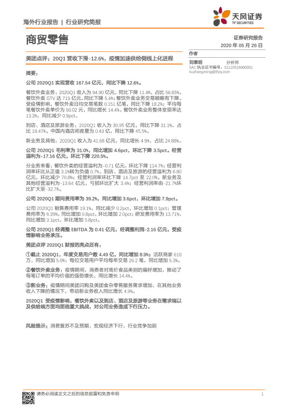 【天风证券】【20200526】商贸零售行业研究简报:美团点评20Q1营收下滑-12.6%-6页