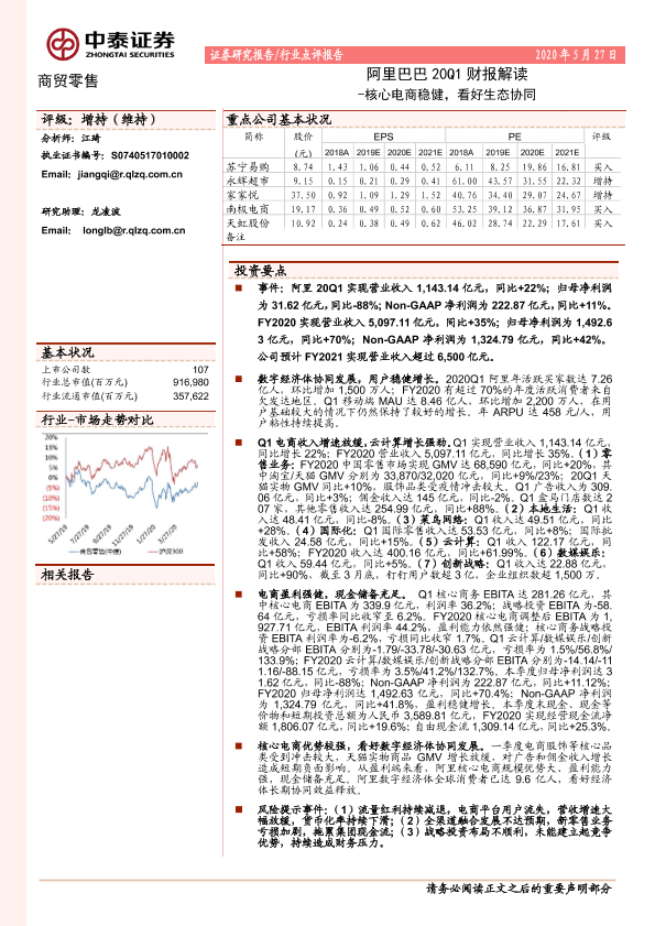 【中泰证券】【20200527】商贸零售行业点评报告:阿里巴巴20Q1财报解读-核心电商稳健,看好生态协同-8页