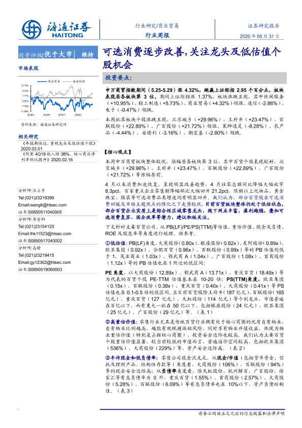 【海通证券】【20200531】商业贸易行业周报:可选消费逐步改善,关注龙头及低估值个股机会-9页