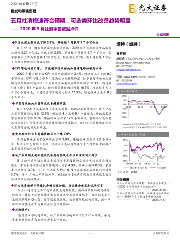 【光大证券】【20200615】2020年5月社消零售数据点评:五月社消增速符合预期,可选类环比改善趋势明显-6页