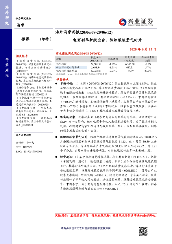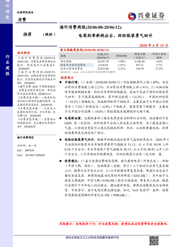 【兴业证券】【20200615】海外消费周报:电商刷单新规出台,纺织服装景气回升-12页