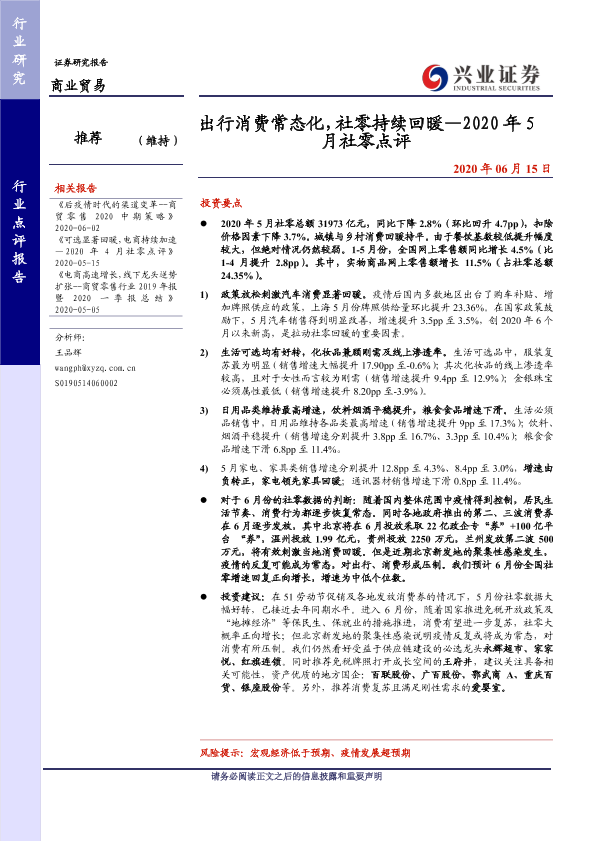 【兴业证券】【20200615】出行消费常态化,社零持续回暖-8页