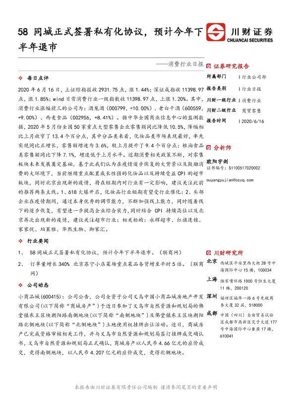 【川财证券】【20200616】消费行业日报:58同城正式签署私有化协议,预计今年下半年退市-3页