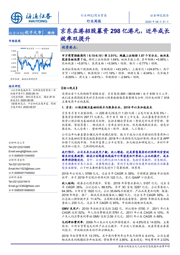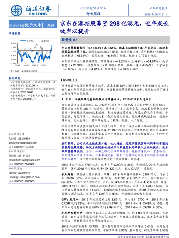 【海通证券】【20200621】商业贸易行业周报:京东在港招股募资298亿港元,近年成长效率双提升-9页