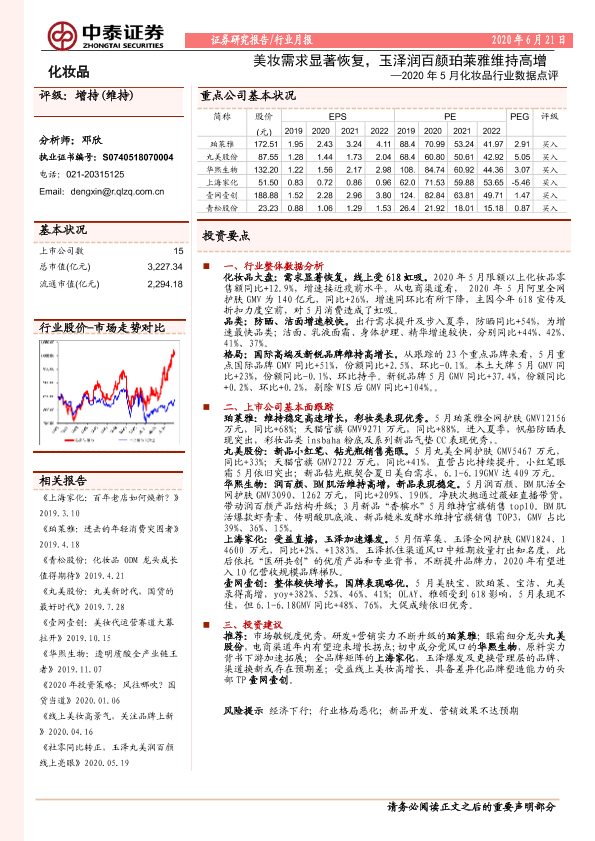 【中泰证券】【20200621】2020年5月化妆品行业数据点评:美妆需求显著恢复,玉泽润百颜珀莱雅维持高增-15页