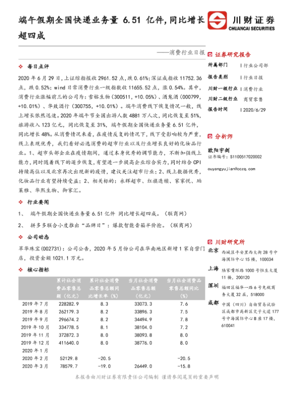 【川财证券】【20200629】消费行业日报:端午假期全国快递业务量6.51亿件,同比增长超四成-3页
