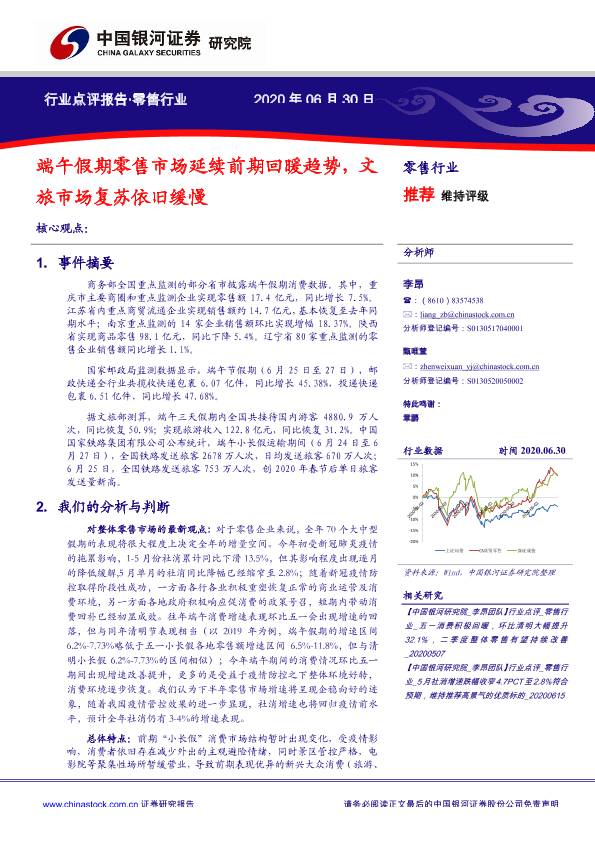 【银河证券】【20200630】零售行业点评报告:端午假期零售市场延续前期回暖趋势,文旅市场复苏依旧缓慢-6页