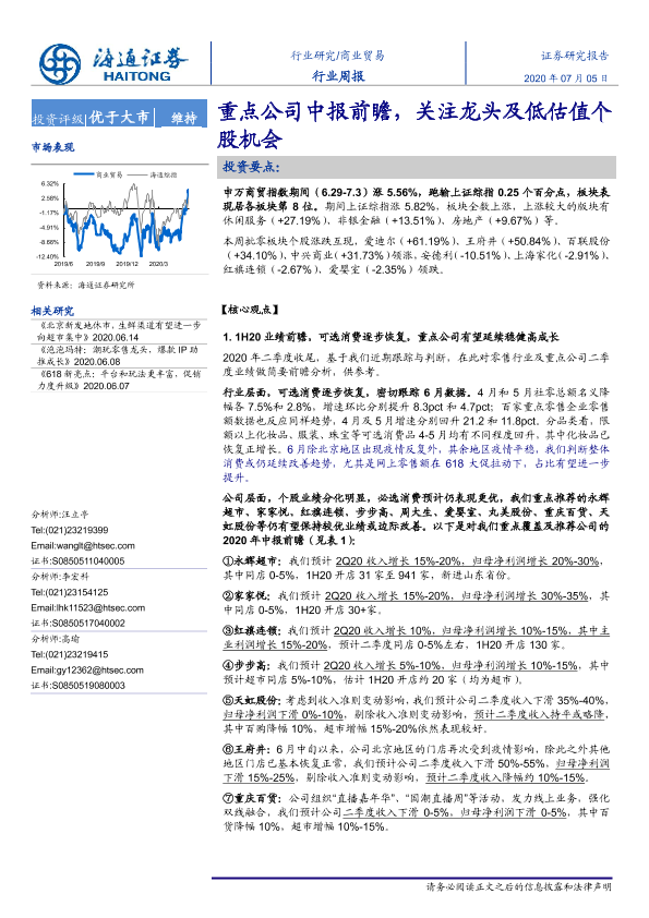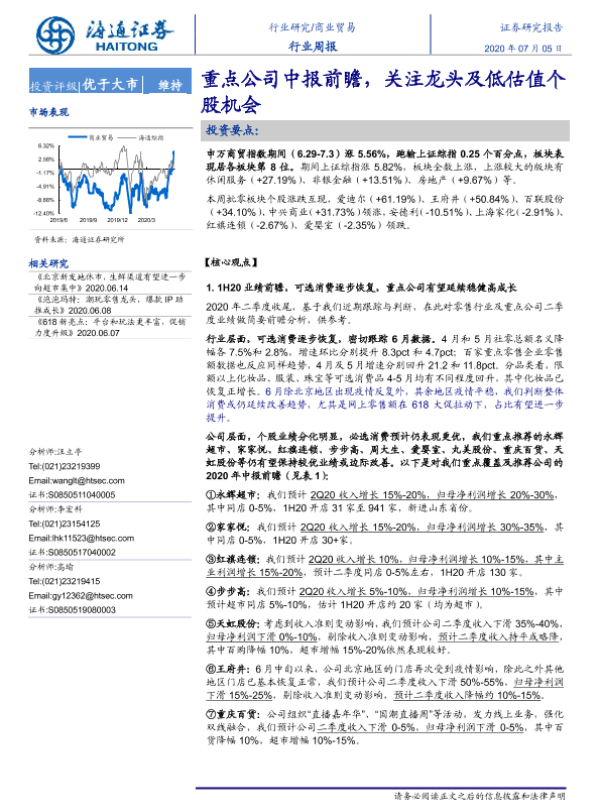 【海通证券】【20200705】商业贸易行业周报:重点公司中报前瞻,关注龙头及低估值个股机会-6页