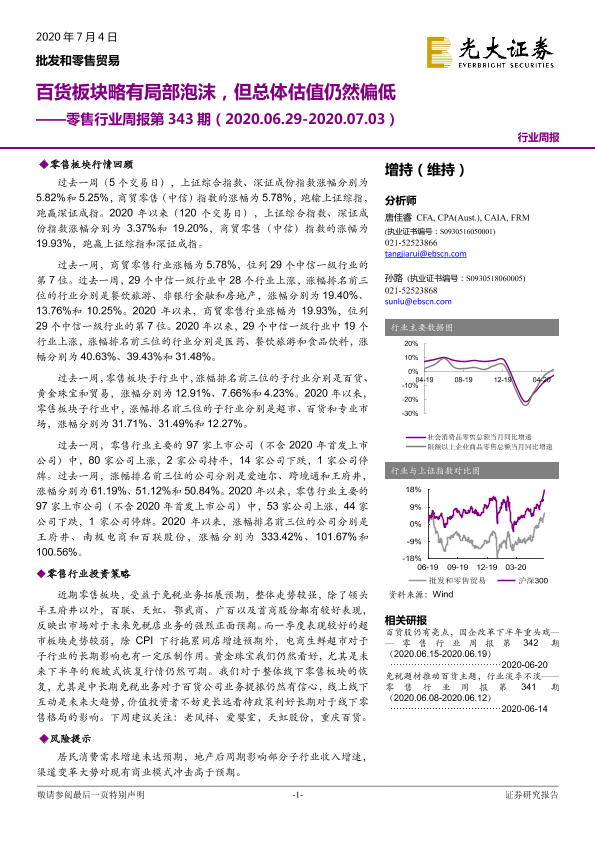 【光大证券】【20200704】零售行业周报第343期:百货板块略有局部泡沫,但总体估值仍然偏低-10页