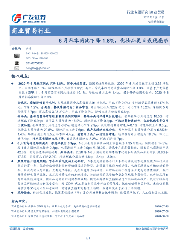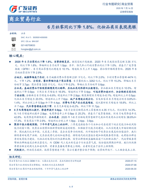 【广发证券】【20200716】6月社零同比下降1.8%,化妆品类目表现亮眼-7页