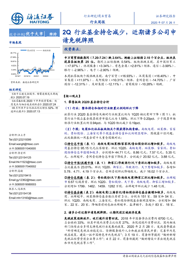 【海通证券】【20200726】商业贸易行业周报:2Q行业基金持仓减少,近期诸多公司申请免税牌照-8页