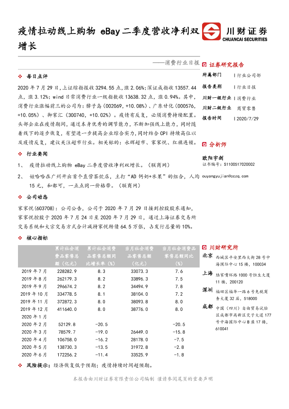 【川财证券】【20200729】消费行业日报:疫情拉动线上购物eBay二季度营收净利双增长-3页
