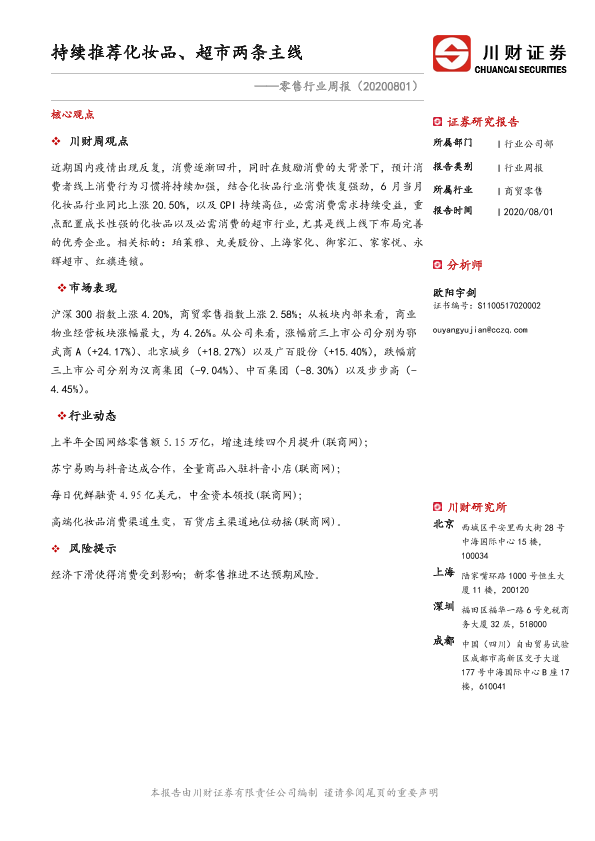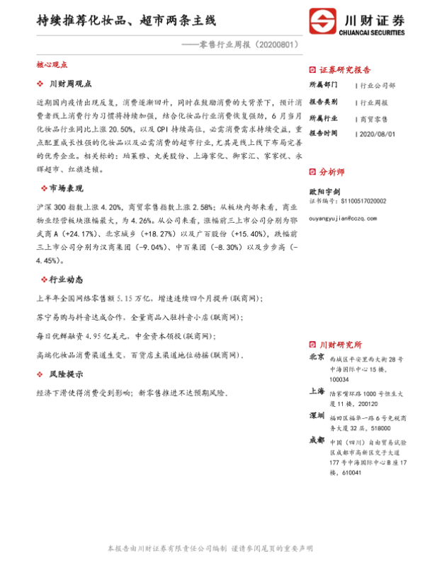 【川财证券】【20200801】零售行业周报:持续推荐化妆品、超市两条主线-13页