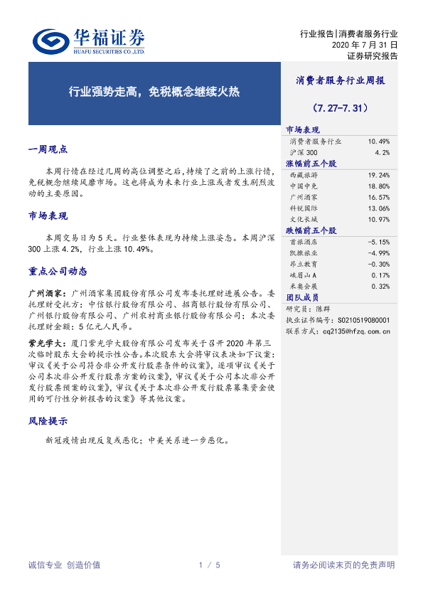 【华福证券】【20200731】消费者服务行业周报:行业强势走高,免税概念继续火热-5页