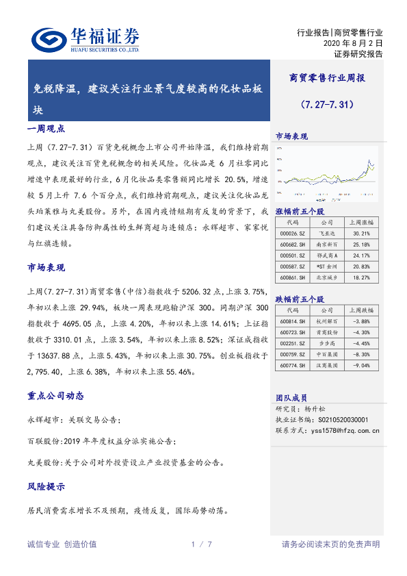 【华福证券】【20200802】商贸零售行业周报:免税降温,建议关注行业景气度较高的化妆品板块-7页