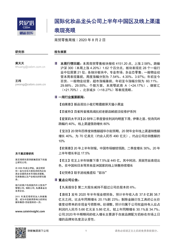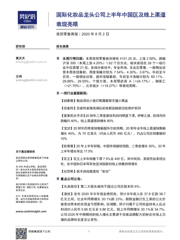 【莫尼塔研究】【20200802】商贸零售周报:国际化妆品龙头公司上半年中国区及线上渠道表现亮眼-8页