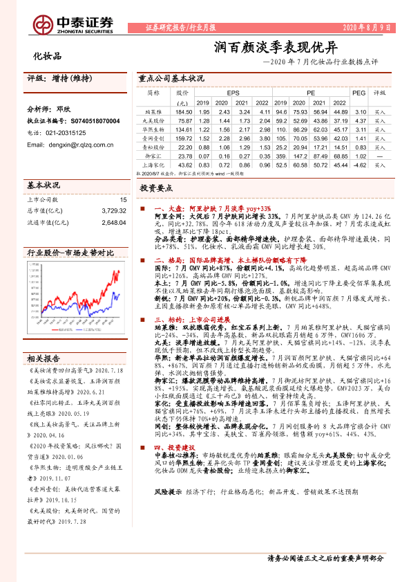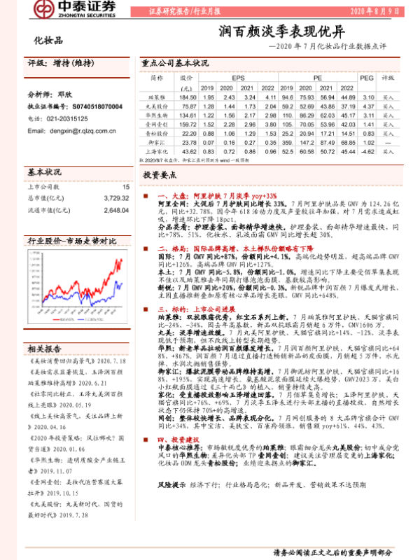 【中泰证券】【20200809】2020年7月化妆品行业数据点评:润百颜淡季表现优异-21页