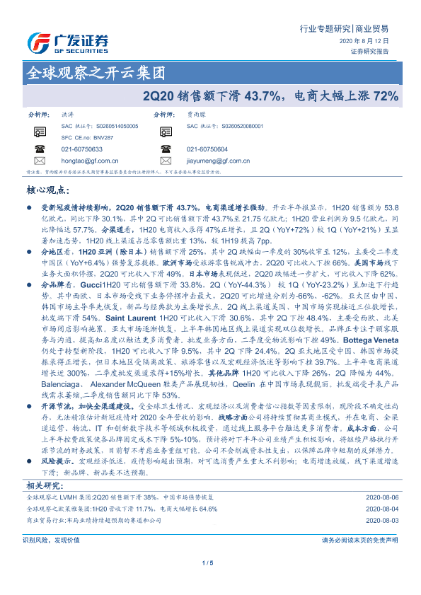 【广发证券】【20200812】全球观察之开云集团:2Q20销售额下滑43.7%,电商大幅上涨72%-5页