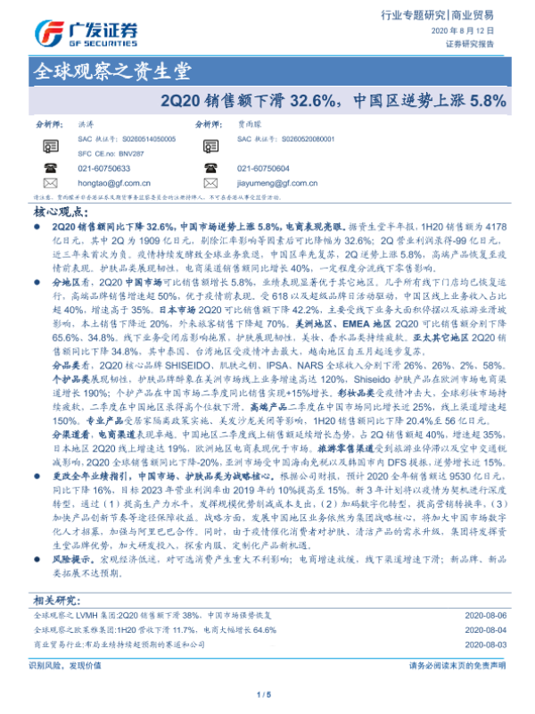 【广发证券】【20200812】全球观察之资生堂:2Q20销售额下滑32.6%,中国区逆势上涨5.8%-5页