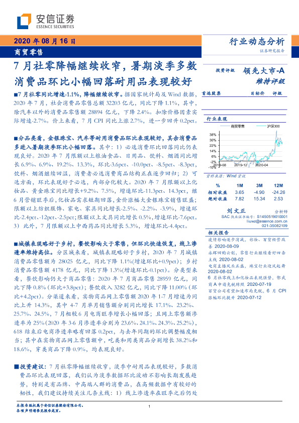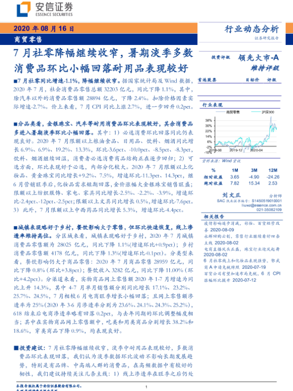 【安信证券】【20200816】7月社零降幅继续收窄,暑期淡季多数消费品环比小幅回落耐用品表现较好-7页
