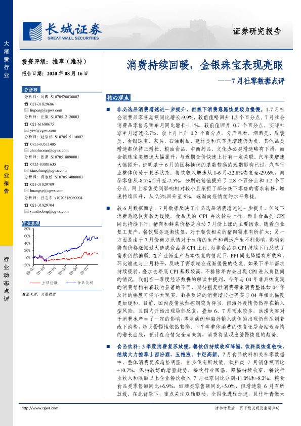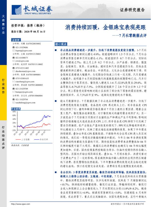【长城证券】【20200816】7月社零数据点评:消费持续回暖,金银珠宝表现亮眼-8页