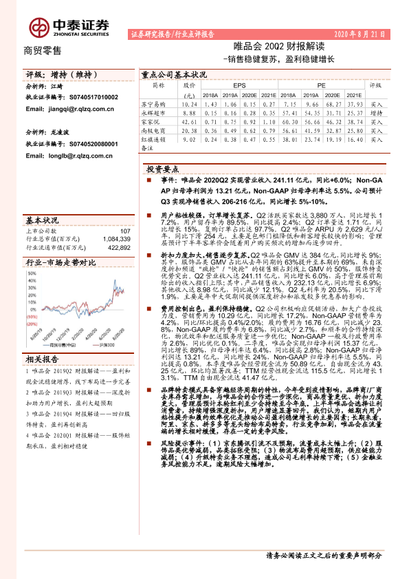 【中泰证券】【20200821】唯品会20Q2财报解读:销售稳健复苏,盈利稳健增长-5页