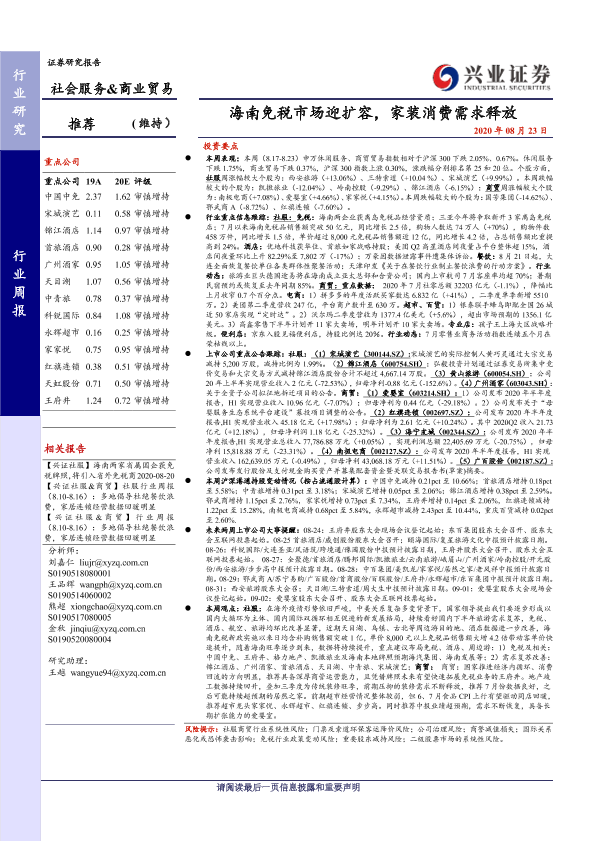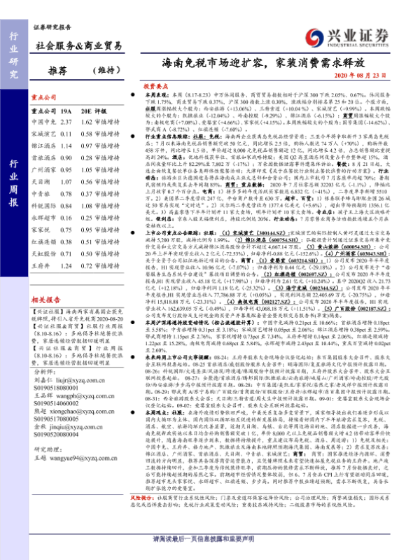 【兴业证券】【20200823】社会服务&商业贸易行业周报:海南免税市场迎扩容,家装消费需求释放-19页