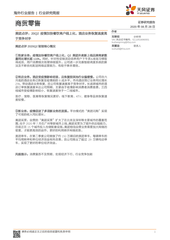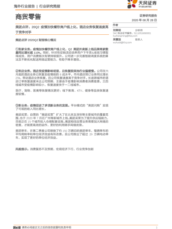 【天风证券】【20200828】商贸零售行业研究简报:美团点评20Q2疫情加快餐饮商户线上化,酒店业务恢复速度高于竞争对手-6页