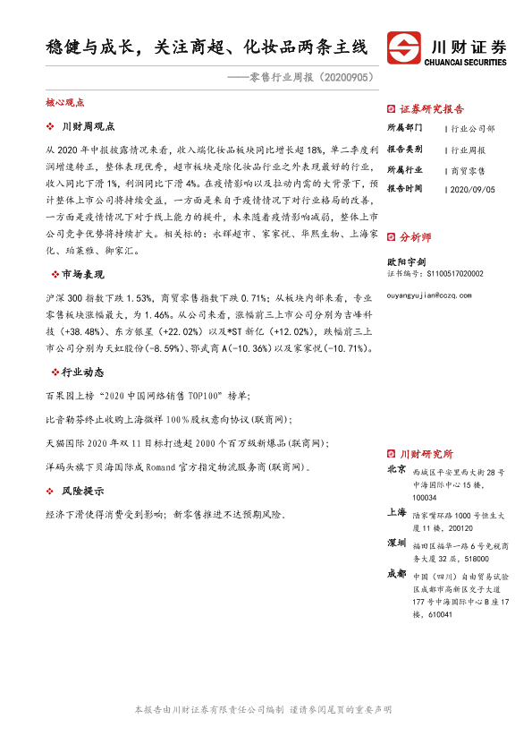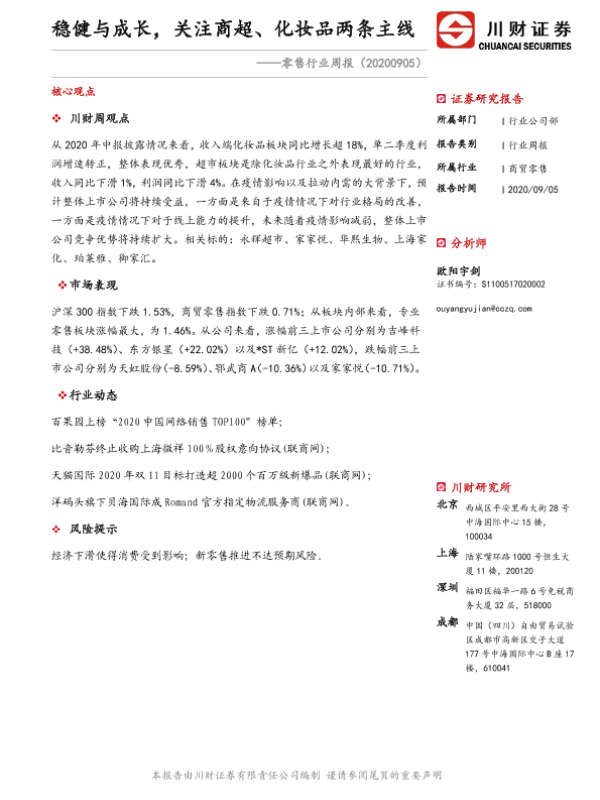 【川财证券】【20200905】零售行业周报:稳健与成长,关注商超、化妆品两条主线-14页