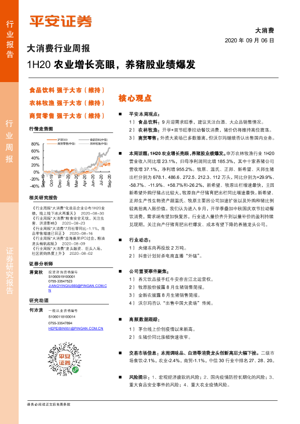 【平安证券】【20200906】大消费行业周报:1H20农业增长亮眼,养猪股业绩爆发-6页