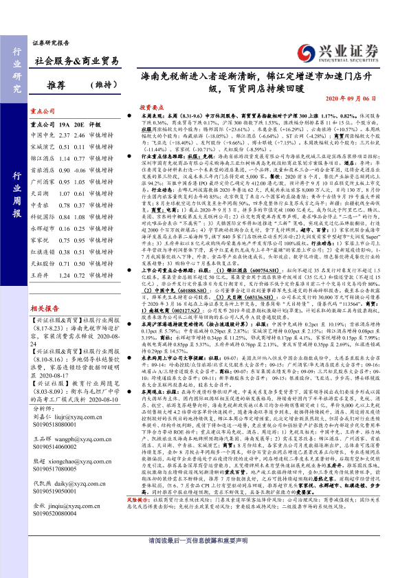 【兴业证券】【20200906】社会服务&商业贸易行业周报:海南免税新进入者逐渐清晰,锦江定增逆市加速门店升级,百货同店持续回暖-17页