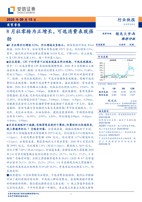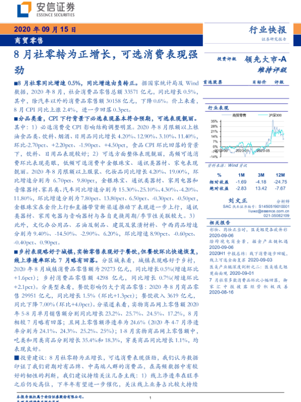 【安信证券】【20200915】8月社零转为正增长,可选消费表现强劲-8页