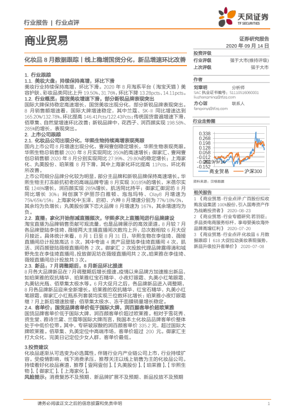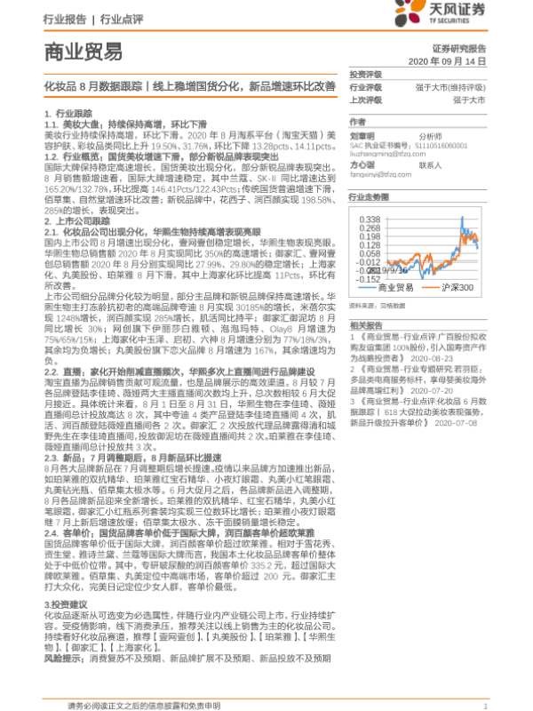 【天风证券】【20200914】化妆品8月数据跟踪丨线上稳增国货分化,新品增速环比改善-8页