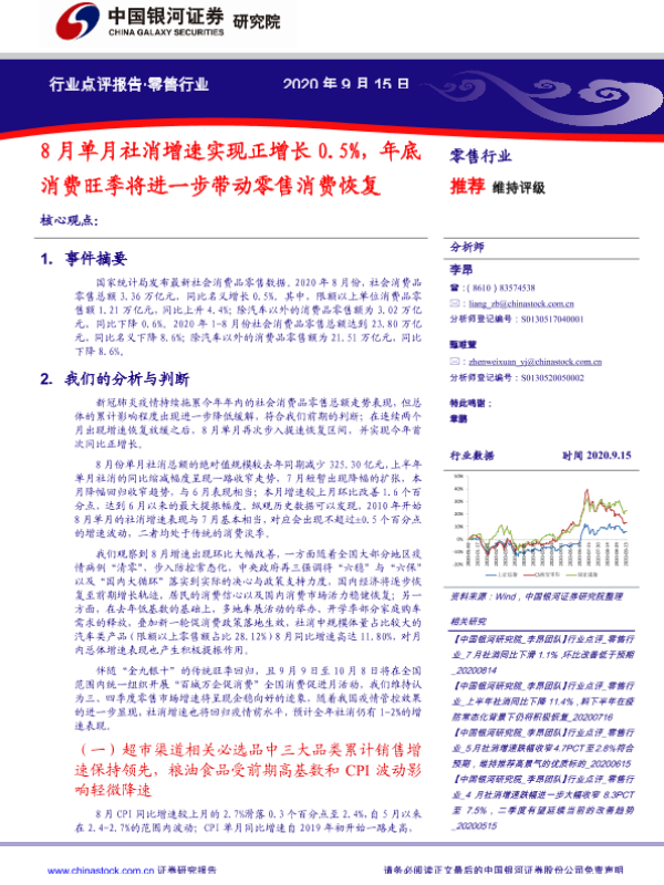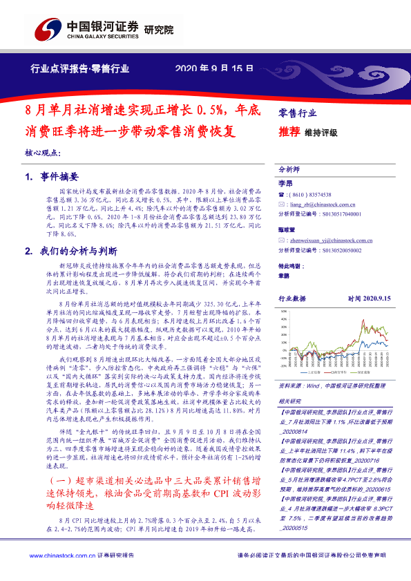 【银河证券】【20200915】8月单月社消增速实现正增长0.5%,年底消费旺季将进一步带动零售消费恢复-5页