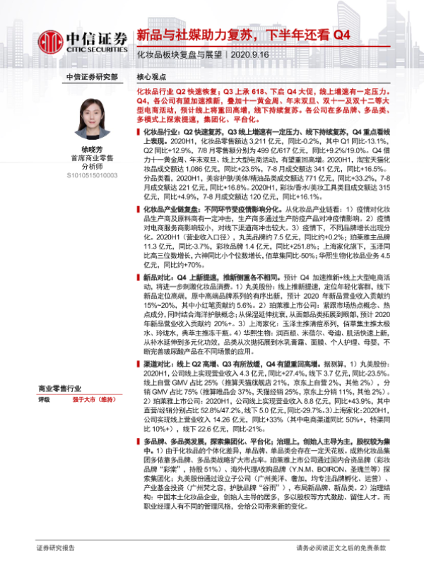 【中信证券】【20200916】化妆品板块复盘与展望:新品与社媒助力复苏,下半年还看Q4-30页
