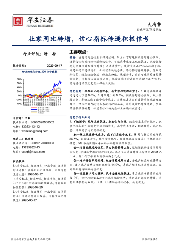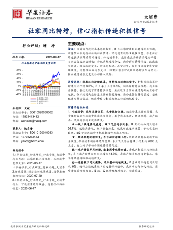 【华安证券】【20200917】大消费深度报告:社零同比转增,信心指标传递积极信号-22页