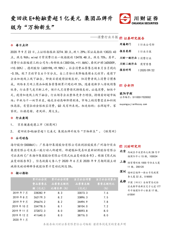 【川财证券】【20200922】消费行业日报:爱回收E+轮融资超1亿美元集团品牌升级为“万物新生”-3页