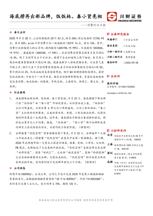 【川财证券】【20200928】消费行业日报:海底捞再出新品牌,饭饭林、秦小贤亮相-3页