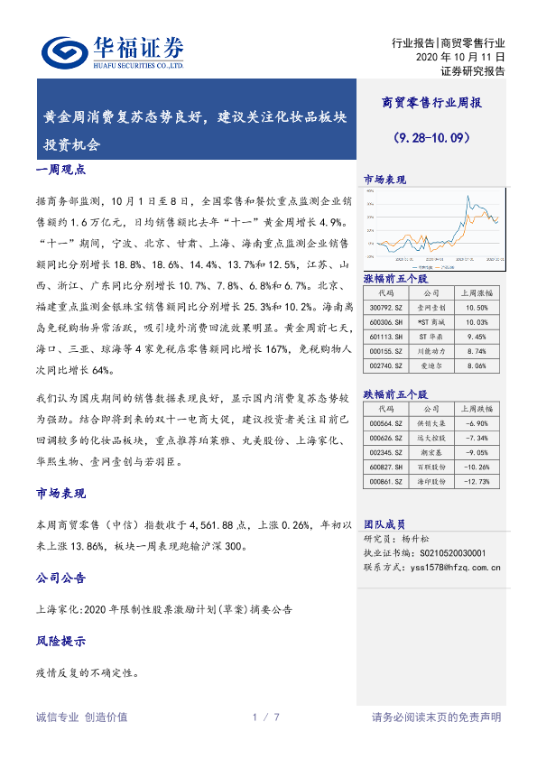 【华福证券】【20201011】商贸零售行业周报:黄金周消费复苏态势良好,建议关注化妆品板块投资机会-7页
