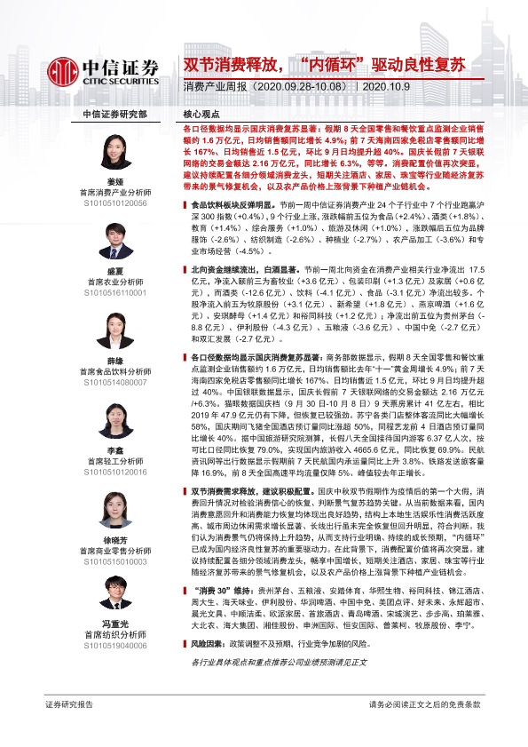 【中信证券】【20201009】消费产业周报:双节消费释放,“内循环”驱动良性复苏-10页